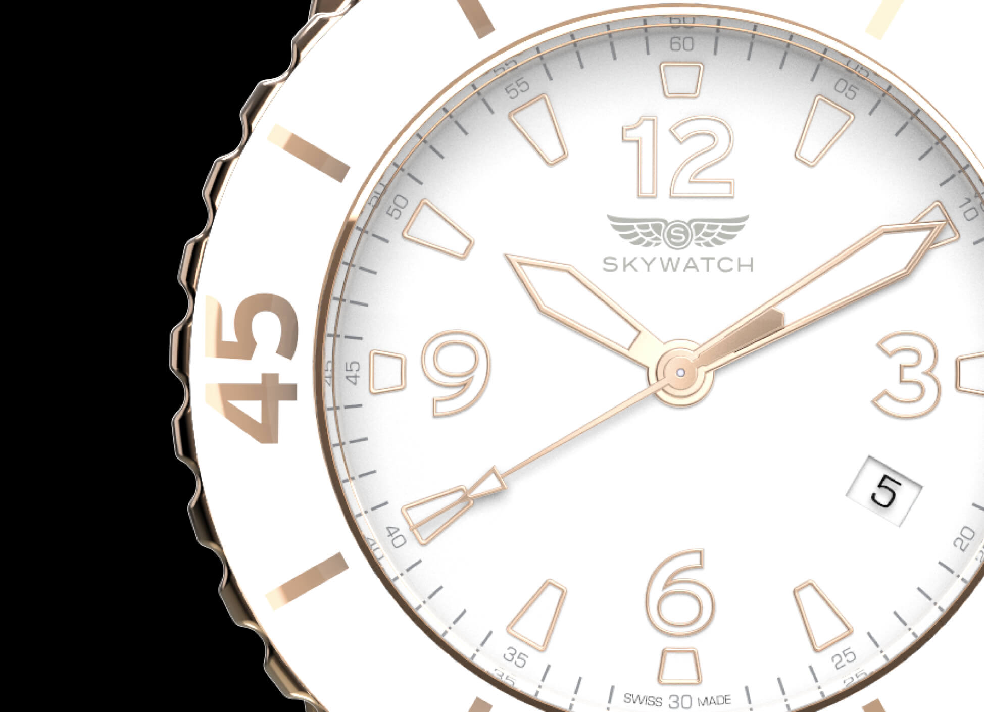 SKYWATCH will, within two (2) years from the date of purchase from an authorized SKYWATCH agent, repair or replace (at SKYWATCH’s option) your watch, with a comparable model, free of charge, if it proves to be defective in material or workmanship under normal use. Not covered by the warranty: batteries, crystals, watch cases, straps, bracelets, normal wear and tear, or loss or theft. The warranty is void if you open the caseback or if moisture gets into the watch by misuse or negligence, such as not pushing or screwing in the crown and exposing the watch to moisture.